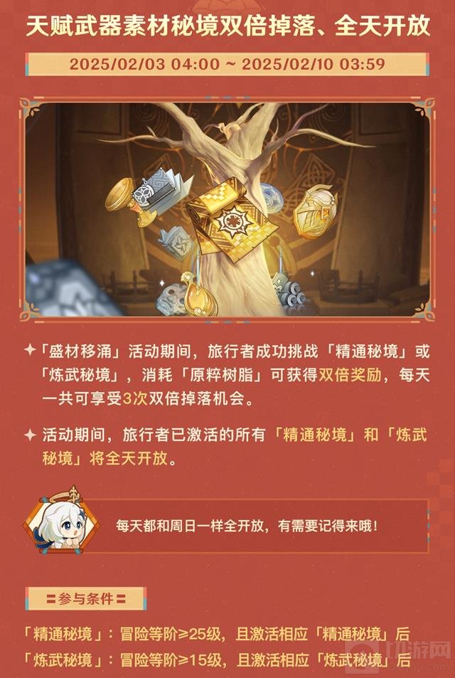 天赋武器素材秘境双倍掉落,全天开放:活动期间,特定秘境(武器素材本、天赋素材本)将提供双倍的天赋武器素材掉落,助力玩家快速提升角色实力。
