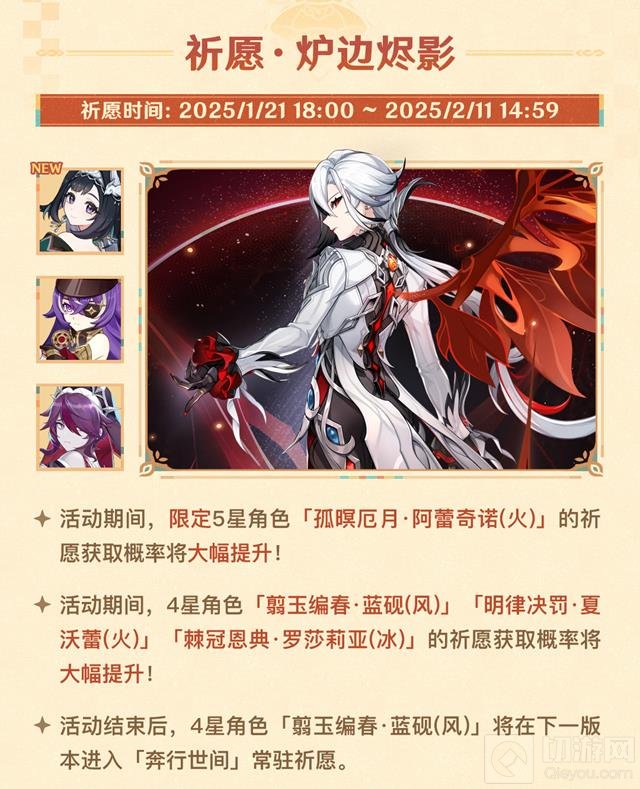 祈愿·炉边烬影:限定五星角色「阿蕾奇诺」的概率大幅提升,同时四星角色「蓝砚」、「夏沃蕾」、「罗莎莉亚」的概率也将提升。