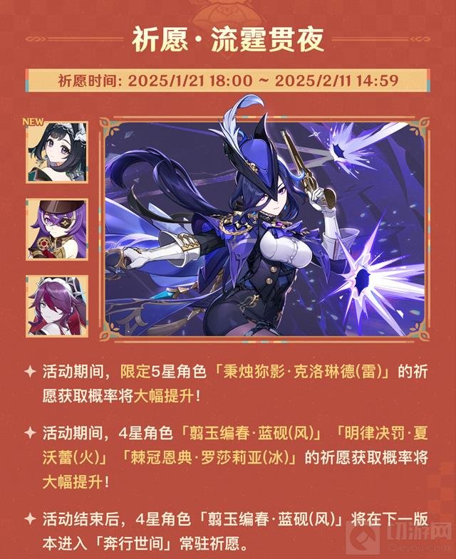 祈愿·流霞贵夜:限定五星角色「克洛琳德」的概率大幅提升,同时四星角色「蓝砚」、「夏沃蕾」、「罗莎莉亚」的概率也将提升。