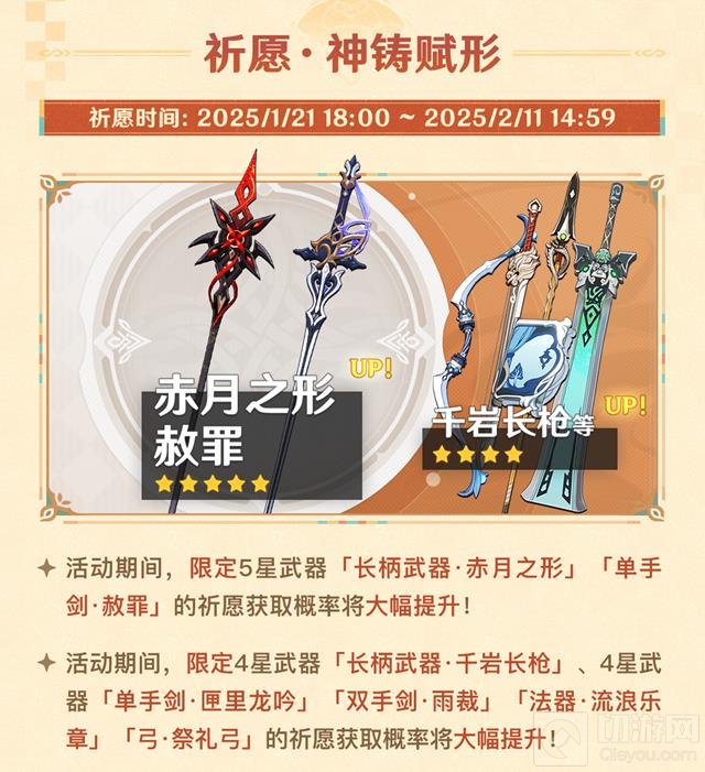 祈愿·神铸赋形:限定五星武器「赤月之形」、「赦罪」的概率大幅提升,同时四星武器「匣里龙吟」、「千岩长枪」、「雨裁」、「流浪乐章」、「祭礼弓」的概率也将提升。