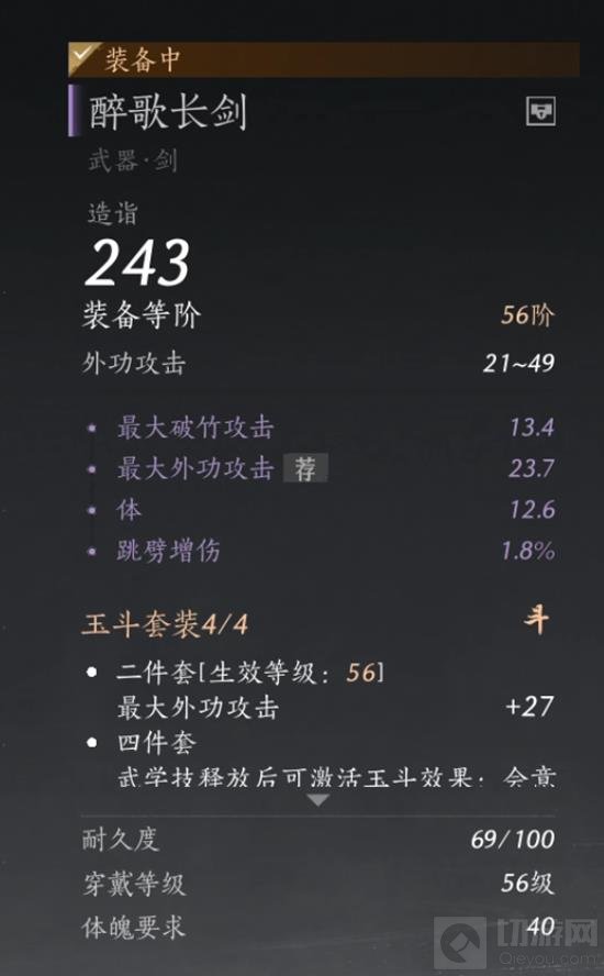 玉斗套装:二件套增加4点最大外功攻击,四件套在使用非蓄力的武学技能后,会意伤害提高20%,持续15秒,如果技能还具有定身效果,则会意伤害额外增加5%,调息时间为30秒。这套装备适合技能频繁释放且以非蓄力技能为主的玩家,能够在技能释放后短时间内大幅提升会意伤害,增强技能的爆发力。