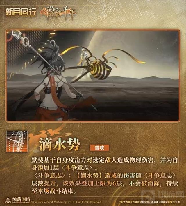 基于自身攻击力对选定敌人造成物理伤害,并为自身添加1层《斗争意志》。《斗争意志》层数越高,【滴水势】造成的伤害越高,最多叠加6层,且不会被消除,持续至战斗结束。