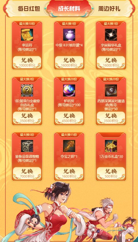 6~10个“福”字:包含200元现金红包、闪亮的一次性强化器(30天)(+15及以下)、夺宝之钥、西部深渊派对邀请函等奖励。