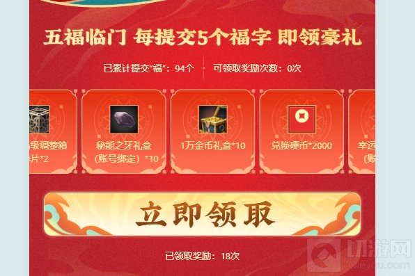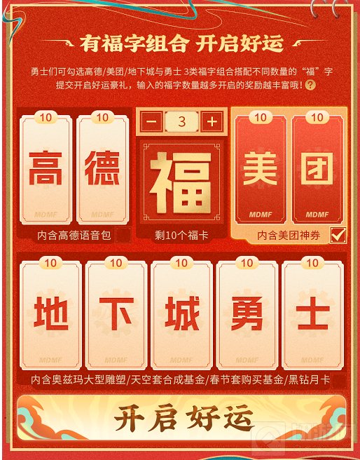 集福赢好礼活动也是本次新春游园会的一大亮点。玩家可以选择美团、高德、地下城勇士这三个任一分区进行集福,通过消耗所选分区内所有类型各一张卡,结合自选数量的福卡来集福。每次提交五个“福”字卡即可领取一次奖励,且提交的“福”字越多,奖励越丰厚。此外,玩家还可以通过祝福口令码邀请好友助力,获取更多的“福”字卡以及随机奖励。
