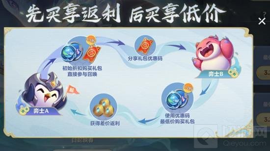 方式2:使用其他弈士分享的优惠码购买礼包,直接享受活动最低价优惠(990点券)3.使用优惠码指,在活动中使用优惠码成功购买礼包4.优惠码获取方式:以活动初始价购买礼包可获得优惠码,1个礼包对应1个优惠码优惠码可分享给其他弈士使用,不可自用5.优惠码使用规则: