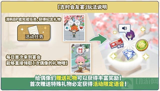 在「吉时会友宴」活动中,制作人可以通过完成每日任务获得纪念礼物,并将这些礼物赠送给偶像以获取丰富奖励。每日任务会在0点刷新,记得及时完成哦!