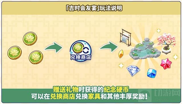 每日首次进入宴会时,制作人可以直接领取一次偶像的礼物,无需消耗任何资源。赠送礼物时,制作人将获得活动限定语音(首次赠送特殊礼物必定获得)、钻石、上级招募券(限时)以及纪念硬币。纪念硬币可以在兑换商店中兑换家具和其他丰厚奖励,记得及时兑换心仪的道具!