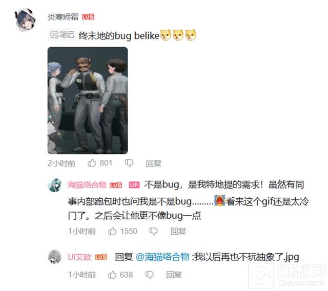 海猫络合物无奈回应道:“这不是BUG,是我特地提的需求!”他还透露,尽管这段动画效果并非BUG,但在游戏内的测试过程中,确实有同事在看到这一幕时误以为是BUG。海猫表示:“看来这个GIF还是太冷门了,之后我会让它看起来更不像BUG一点。”