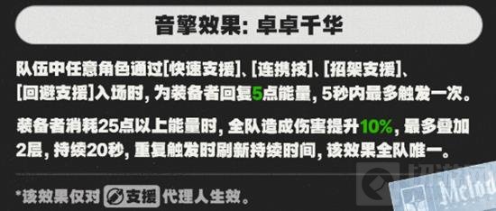 队伍中任意角色通过[快速支援】、【连携技]、招架支援][回避支援]入场时,为装备者回复5点能量,5秒内最多触发一次。装备者消耗25点以上能量时,全队造成伤害提升10%,最多叠加2层,持续20秒,重复触发时刷新持续时间,该效果全队唯一。