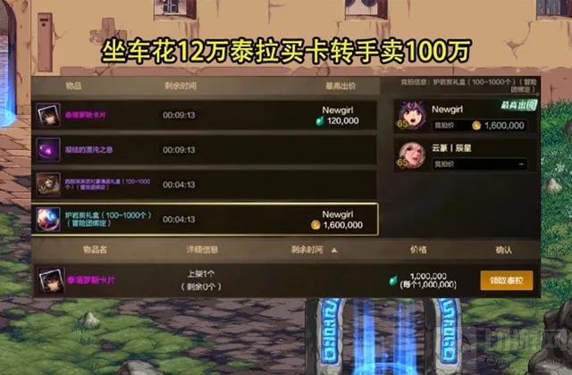 不仅如此,由于打手没有翻牌奖励次数,老板们还可以包下竞拍,获得更多的奖励。有玩家在竞拍中花费12万泰拉买下双16属强卡,随后在拍卖行上架100万泰拉,轻松赚取巨额利润。这种模式下,玩家只需花费少量泰拉,就能坐车坐到装备毕业。