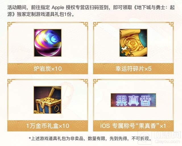 玩家在活动期间前往指定Apple授权专营店扫码签到,即可领取《地下城与勇士:起源》独家定制游戏道具礼包1份,内含: