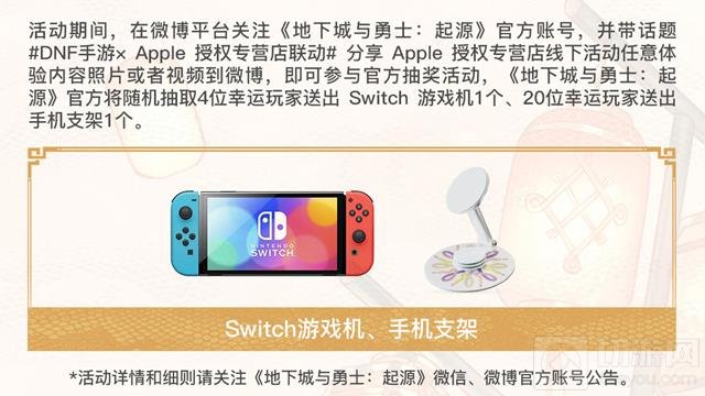 活动期间,玩家在微博平台关注《地下城与勇士:起源》官方账号,并带话题#DNF手游× Apple 授权专营店联动#分享线下活动体验内容(照片或视频),即可参与官方抽奖活动。奖品包括: