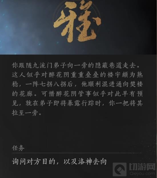 在开封的醉花阴,玩家得知九流门弟子计划夺回寒姨的“无面人名单”。这份名单被南唐使者抢走,而玩家需要协助九流门将其找回。任务过程中,玩家将深入樊楼,与各色人物互动,揭露背后的阴谋。