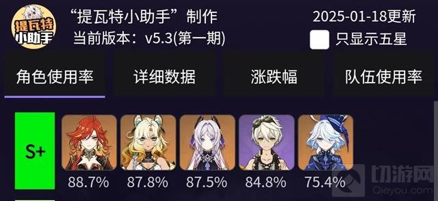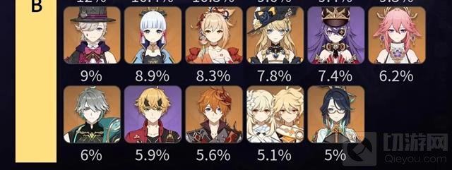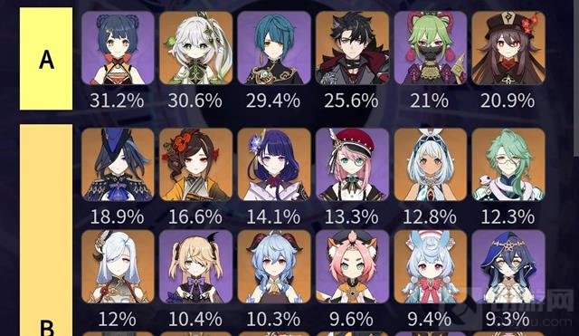 值得注意的是,纳塔系列的角色在这一期中表现突出,占据了S+使用率角色中的三个席位。这三位角色分别是最强输出、最强万金油辅助以及集增伤与护盾于一体的角色,它们的强度不容小觑。特别是班尼特和水神,即便在水系角色普遍被针对的情况下,依然表现出色。