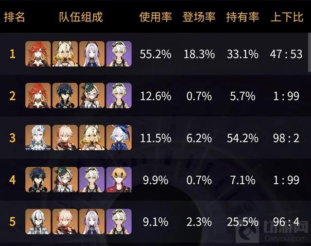 在队伍使用率方面,纳塔战舰阵容登顶,而水龙王的龙芙万希则从第一名跌至第三名。尽管如此,他们的强度依然很高,能够依靠三个顶级辅助强行输出,即使面对70%的水抗也不在话下。