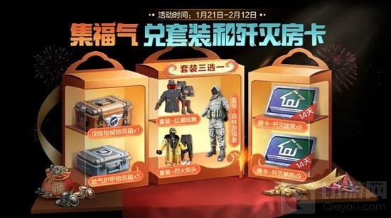 1月21日-2月12日,邀请好友上线可集福气值,消耗福气值可兑换奖励,包含:套装三选一、歼灭4V4房卡、歼灭1V1房卡、顶级枪械物资箱,欧气护甲物资箱,物资币、服饰币、福利碎片等!歼灭房卡每周有兑换上限,顶级枪械物资箱需1月25日开启兑换哦