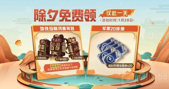 除夕(1月28日当天)登录即可从开运背包(5级)、生财背包(6级)、纳福背包(7级)3个背包中随机获取1人,背包附属专属词条:金蛇庇佑,背包装备状态下,特种兵被淘汰后该装备(背包本身)不会掉落!