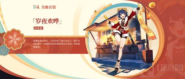 在璃月港内,旅行者将会造访各种节庆玩具,并通过互动提升进度。随着节庆热度的提升,玩家将解锁更多奖励,并最终获得香菱限定衣装「岁夜欢哗」和璃月四星角色的自选邀约。