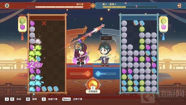 旅行者需要调整方块的下落位置与角度,消除场上的方块,为己方藤人提供增益,并击败对手的藤人。该玩法考验玩家的策略和反应能力。