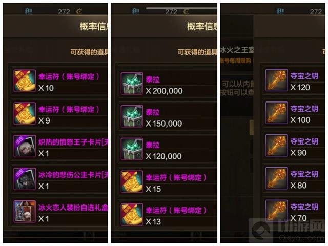那么 990 点券的礼包值得入手吗?答案是值得!这个礼包可以开出夺宝之钥、幸运符、泰拉、王子和公主卡片,还有冰火恋人装扮自选礼盒。夺宝之钥最少能拿 70 个,参考商城赛丽亚的幸运 4500 万泰拉能买 3 个,相当于 10.5 万泰拉;幸运符最低 9 张需要 1080 点券;泰拉最低能拿 12 万泰拉;冰火恋人装扮自选礼盒可以上架拍卖行,目前能卖 20 万泰拉,秒被拍走!