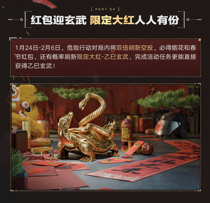 在危险行动对局中,双倍刷新空投,必得烟花和春节红包,并有概率刷新限定大红——乙巳玄武。完成活动任务还能直接获得乙巳玄武。