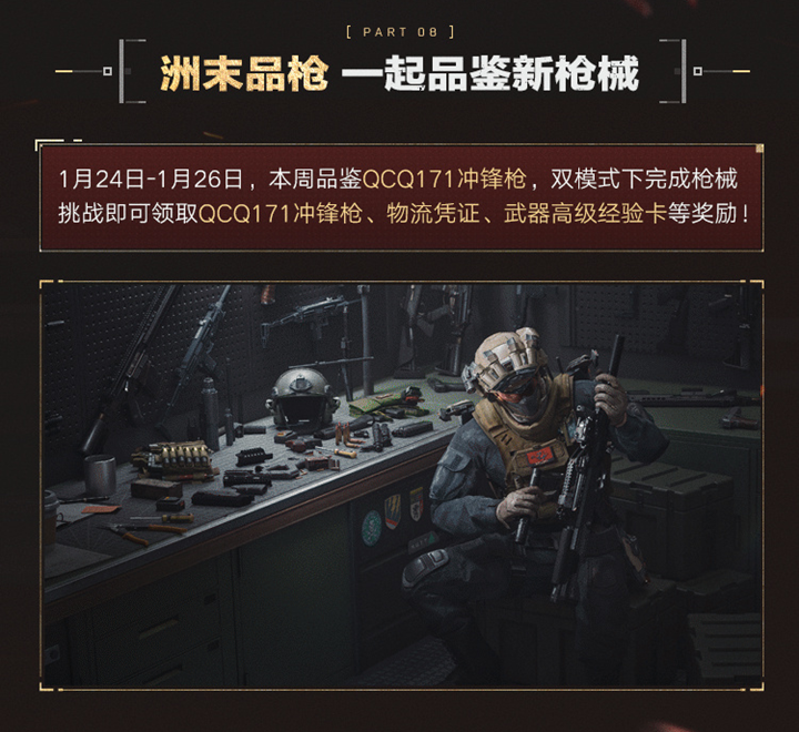本周品鉴QCQ171冲锋枪,双模式下完成枪械挑战即可领取QCQ171冲锋枪、物流凭证、武器高级经验卡等奖励。