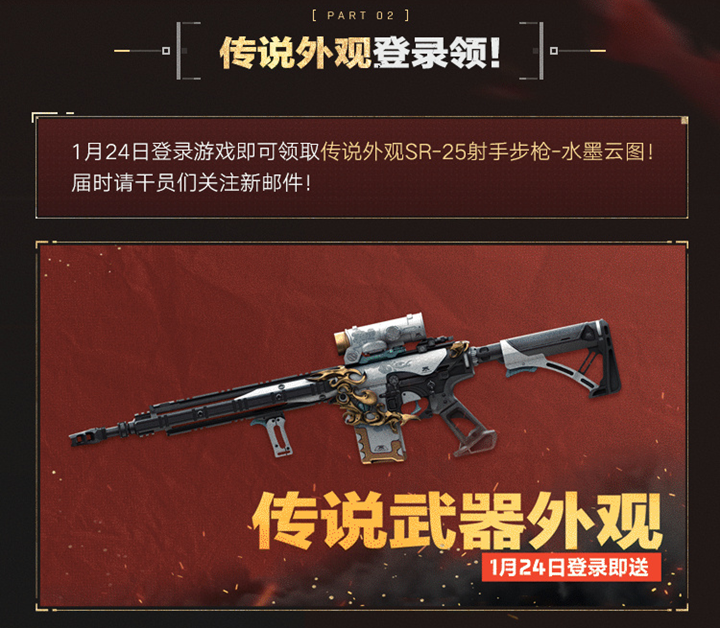 玩家在1月24日登录游戏即可领取传说外观SR-25射手步枪——水墨云图。
