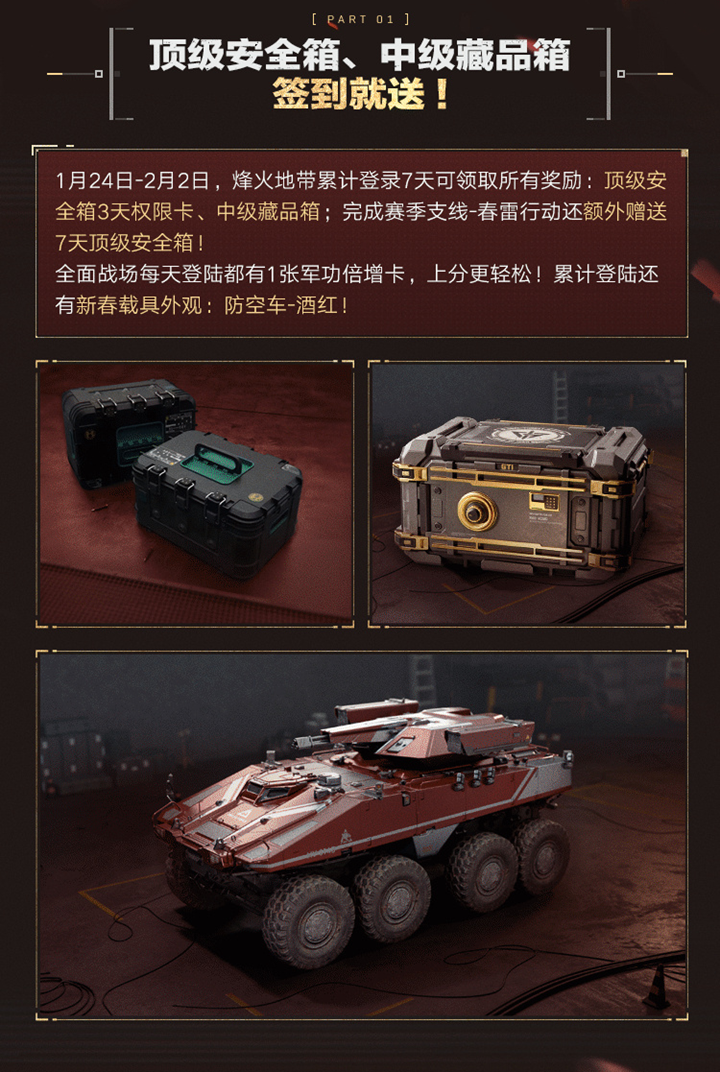 其他福利:全面战场每天登录都有1张军功倍增卡,上分更轻松;累计登录还有新春载具外观:防空车-酒红。