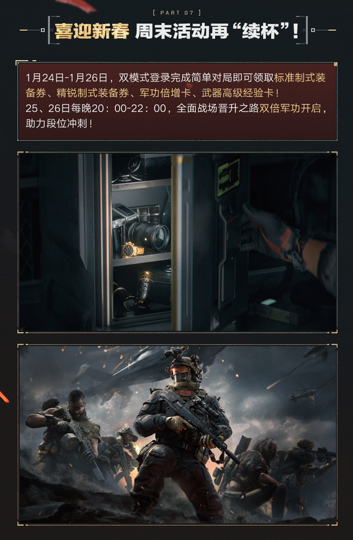 双模式登录完成简单对局即可领取标准制式装备券、精锐制式装备券、军功倍增卡、武器高级经验卡。每晚20:00-22:00,全面战场晋升之路双倍军功开启,助力段位冲刺。