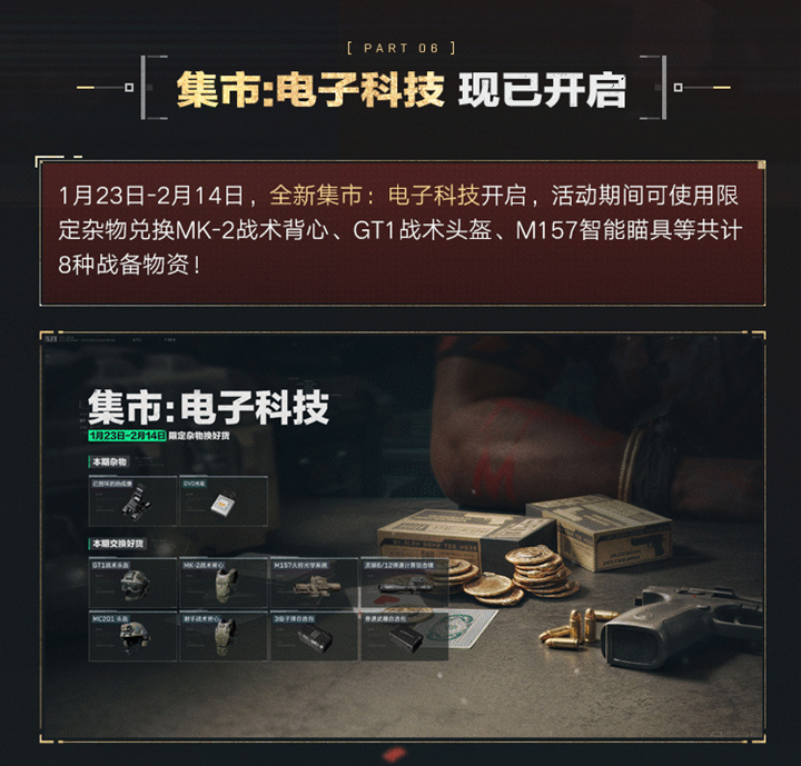 全新集市“电子科技”开启,活动期间可用限定杂物兑换MK-2战术背心、GT1战术头盔、M157智能瞄具等8种战备物资。