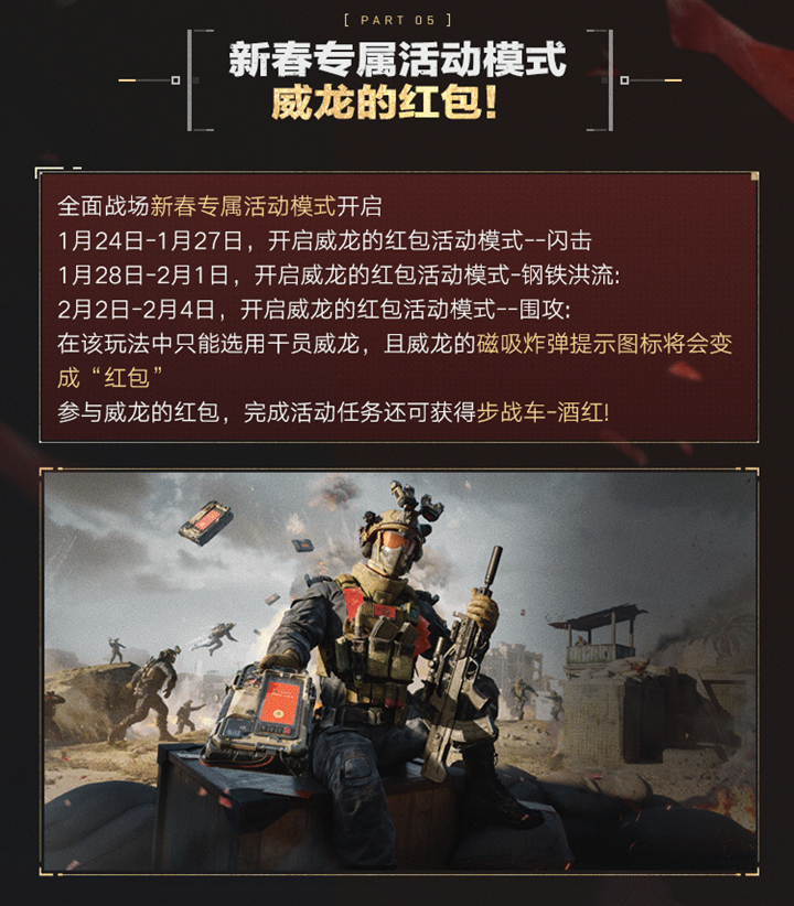 玩家在特定活动期间参与威龙的红包模式,只能使用干员威龙,威龙的磁吸炸弹提示图标将变为“红包”。完成活动任务可获得步战车-酒红。