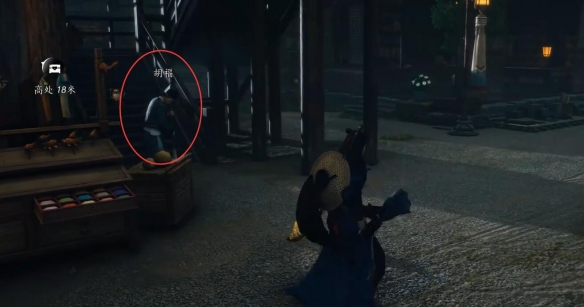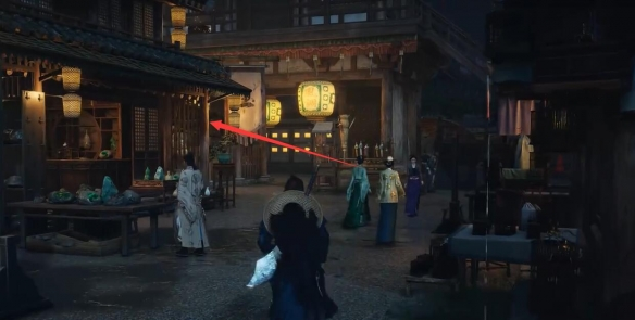 到了杂卖场后,往前走从右边的牌坊进去,走到绿色灯笼处后左拐进店铺,对话陈宝来出来后直走几步就能看见胡福。
