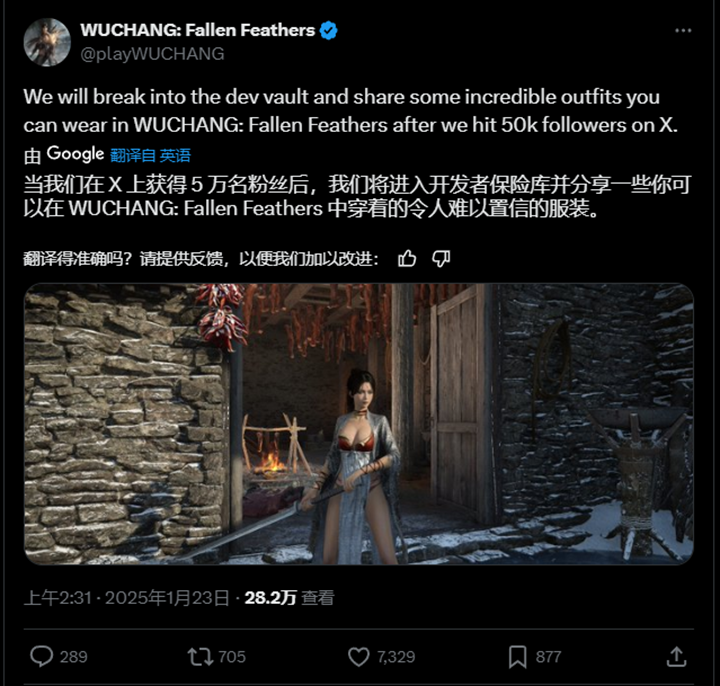 2025年1月23日,国产类魂动作游戏《明末:渊虚之羽》(WUCHANG: Fallen Feathers)的官方X账号发布了一条令玩家振奋的消息:当粉丝数达到5万后,将分享一些玩家可在游戏中穿戴的“令人难以置信”的服装设计。官推原文写道:“We will break into the dev vault and share some incredible outfits you can wear in WUCHANG: Fallen Feathers after we hit 50k followers on X.”