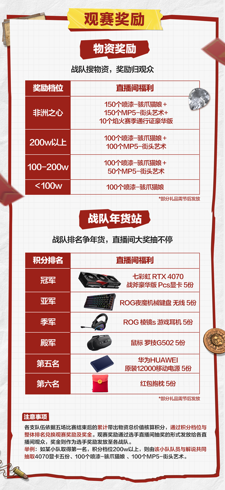 - 直播间福利:根据主播战队的积分和排名,直播间将发放七彩虹RTX4070显卡、夜魔机械键盘、棱镜s游戏耳机等丰厚福利。