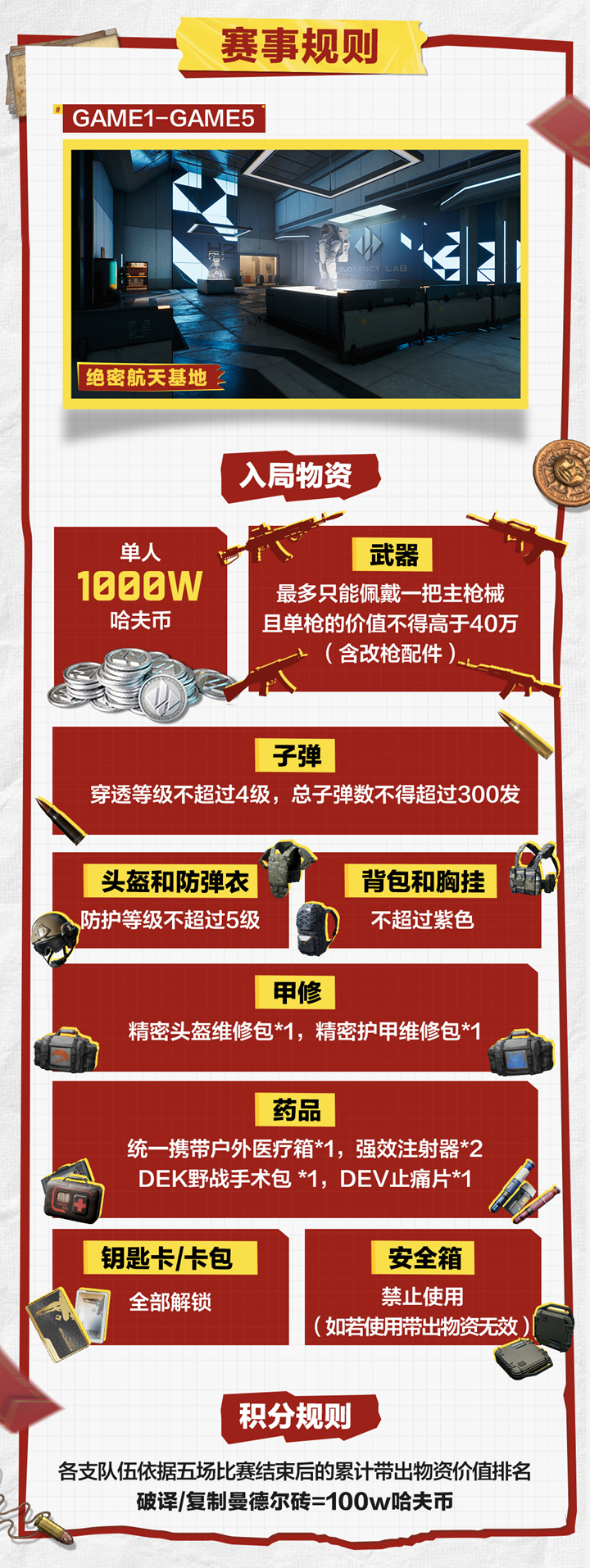 - 积分规则:各支战队将通过五场比赛累计带出物资的总价值来计算积分。破坏/复制曼德尔砖可获得100万哈夫币的积分。战队积分将决定最终的排名和奖金分配。