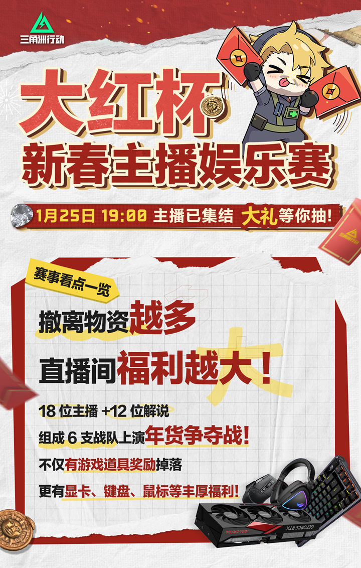 《三角洲行动》主播娱乐赛《大红杯》即将于2025年1月25日19点盛大开赛。此次赛事集结了来自五大平台的实力主播,他们将组成六支战队,在游戏中展开激烈的角逐,争夺丰厚的新春福利。