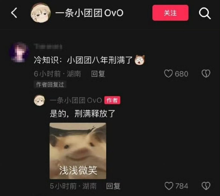 此前,有网友在“小团团”社交平台账号下留言调侃:“小团团八年刑满了。”此类留言本为玩笑,但她幽默的回复反而为事件增添了一份轻松氛围,引起了大量关注和讨论。一些粉丝表示欣喜于她的回归,并期待她继续带来更多内容。