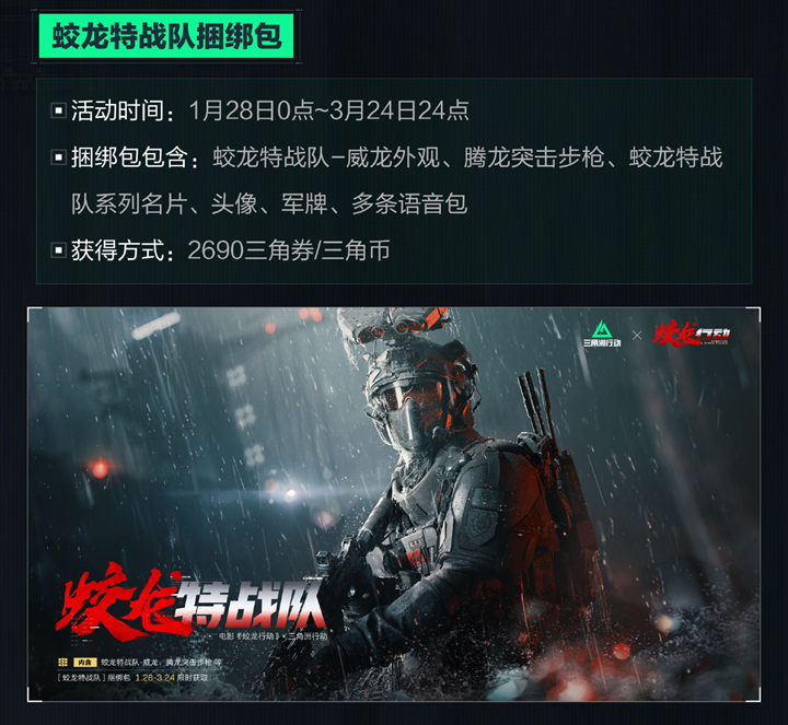 蛟龙特战队捆绑包:活动时间为1月28日0点至3月24日24点,内容包括蛟龙特战队-威龙外观、腾龙突击步枪、蛟龙特战队系列名片、头像、军牌、多条语音包,获得方式为2690三角券/三角币。