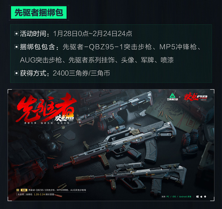 先驱者捆绑包:活动时间为1月28日0点至2月24日24点,内容包括先驱者-QBZ95-1突击步枪、MP5冲锋枪、AUG突击步枪、先驱者系列挂饰、头像、军牌、喷漆,获得方式为2400三角券/三角币。