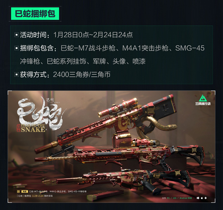 巳蛇捆绑包:活动时间为1月28日0点至2月24日24点,内容包括巳蛇-M7战斗步枪、M4A1突击步枪、SMG-45冲锋枪、巳蛇系列挂饰、军牌、头像、喷漆,获得方式为2400三角券/三角币。