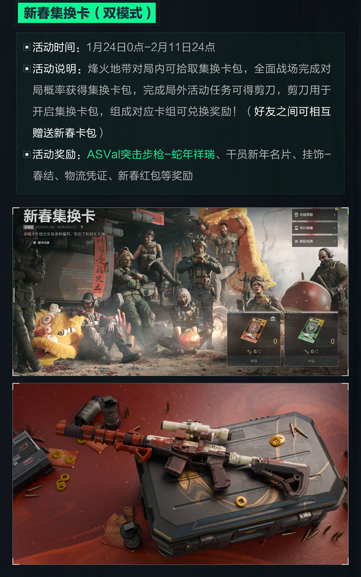 新春集换卡(双模式):活动时间为1月24日0点至2月11日24点,烽火地带对局内可拾取集换卡包,全面战场完成对局概率获得集换卡包,完成局外活动任务可得剪刀,剪刀用于开启集换卡包,组成对应卡组可兑换奖励,活动奖励为ASVal突击步枪-蛇年祥瑞、干员新年名片、挂饰-春结、物流凭证、新春红包等奖励。