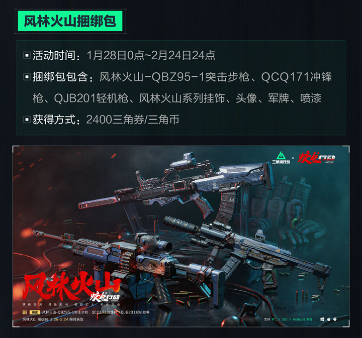 风林火山捆绑包:活动时间为1月28日0点至2月24日24点,内容包括风林火山-QBZ95-1突击步枪、QCQ171冲锋枪、QJB201轻机枪、风林火山系列挂饰、头像、军牌、喷漆,获得方式为2400三角券/三角币。