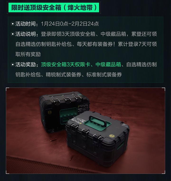 限时送顶级安全箱(烽火地带):活动时间为1月24日0点至2月2日24点,登录即领3天顶级安全箱、中级藏品箱,累登还可领取自选精选仿制钥匙补给包,每天都有装备券,累计登录7天可领取所有奖励。