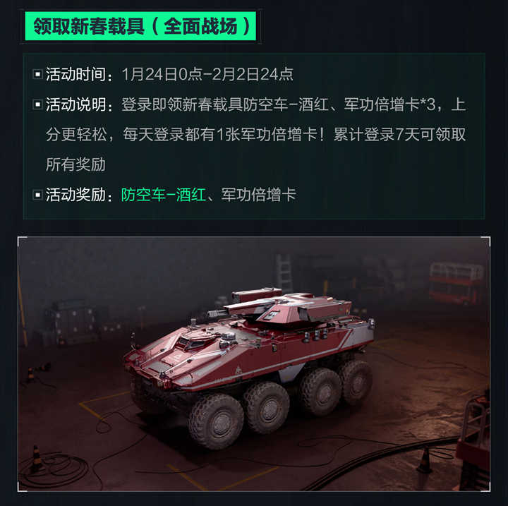 领取新春载具(全面战场):活动时间为1月24日0点至2月2日24点,登录即领新春载具防空车-酒红、军功倍增卡*3,分更轻松,每天登录都有1张军功倍增卡,累计登录7天可领取所有奖励,活动奖励为防空车-酒红、军功倍增卡。