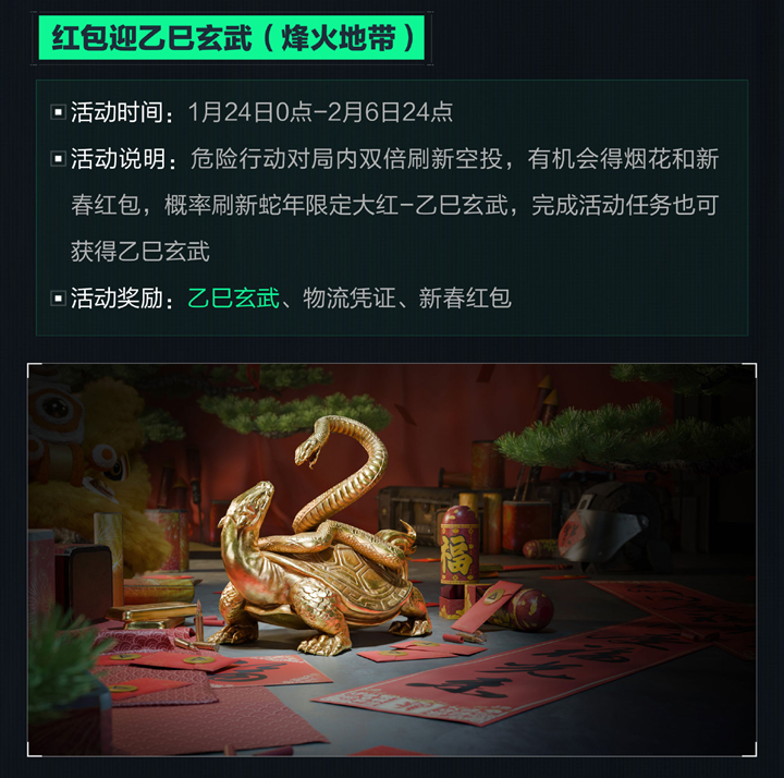 红包迎乙已玄武(烽火地带):活动时间为1月24日0点至2月6日24点,危险行动对局内双倍刷新空投,有机会得烟花和新春红包,概率刷新蛇年限定大红-乙已玄武,完成活动任务也可获得乙已玄武,活动奖励为乙已玄武、物流凭证、新春红包。