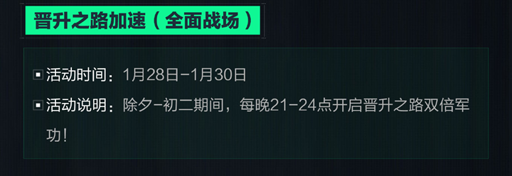 晋升之路加速(全面战场):活动时间为1月28日-1月30日,除夕-初二期间,每晚21-24点开启晋升之路双倍军功。