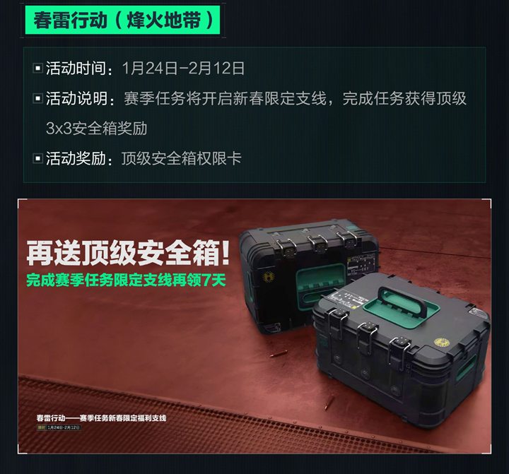 春雷行动(烽火地带):活动时间为1月24日-2月12日,赛季任务将开启新春限定支线,完成任务获得顶级3x3安全箱奖励,活动奖励为顶级安全箱权限卡。完成赛季任务限定支线再领7天。