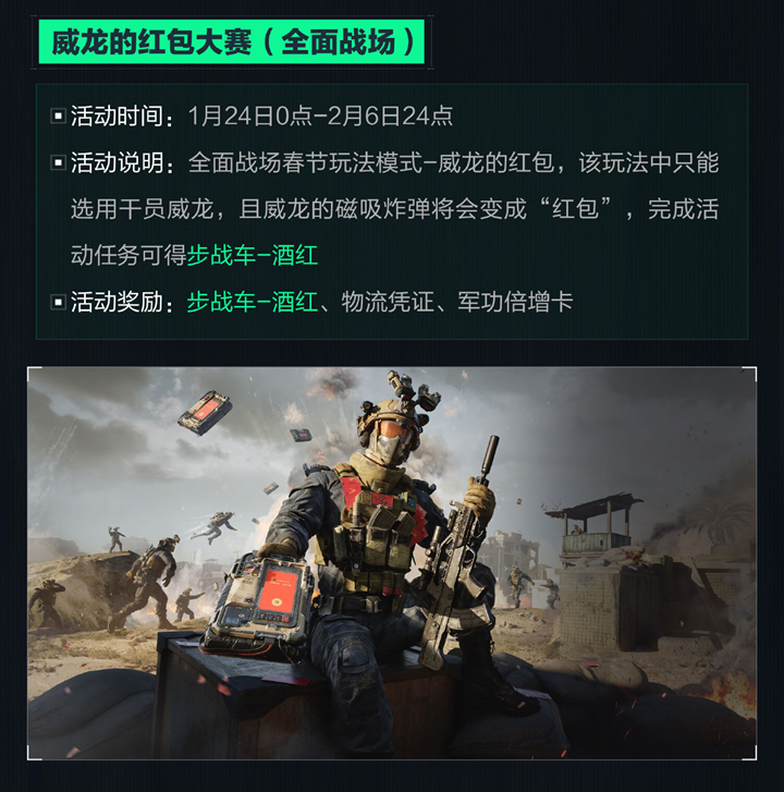 威龙的红包大赛(全面战场):活动时间为1月24日0点至2月6日24点,全面战场春节玩法模式-威龙的红包,该玩法中只能选用干员威龙,且威龙的磁吸炸弹将会变成“红包”,完成活动任务可得步战车-酒红,活动奖励为步战车-酒红、物流凭证、军功倍增卡。
