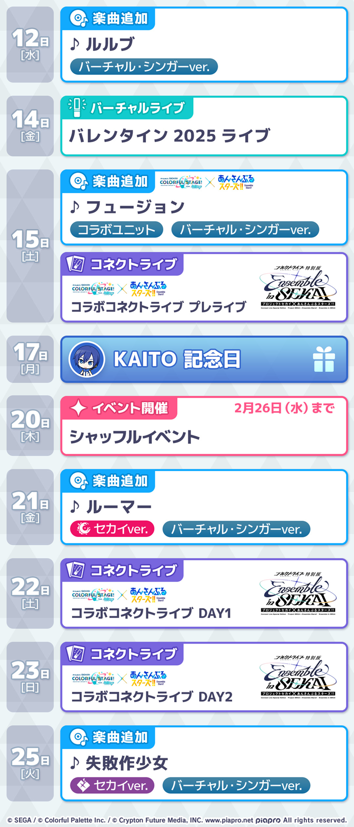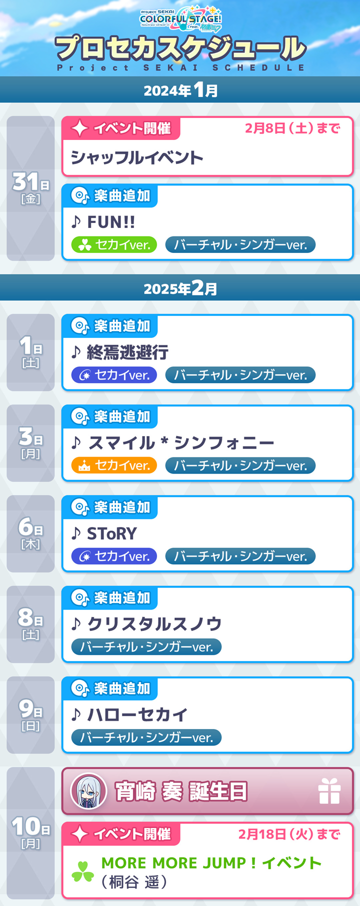 《世界计划多彩舞台》日服公布了最新的2025年二月份活动信息一览,很多小伙伴看到活动相关内容就有些看不懂,或是想要查阅相关内容,下面请看切游小编整理的活动相关信息情报。