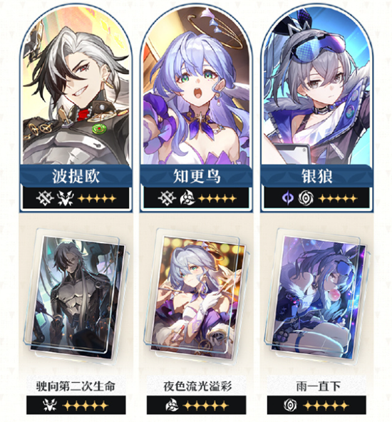 限定5星角色「阿格莱雅(记忆•雷)」「波提欧(巡猎•物理)」「知更鸟(同谐•物理)」「银狼(虚无•量子)」,4星角色「停云(同谐•雷)」「寒鸦(同谐•物理)」「素裳(巡猎•物理)」跃迁成功概率限时提升。